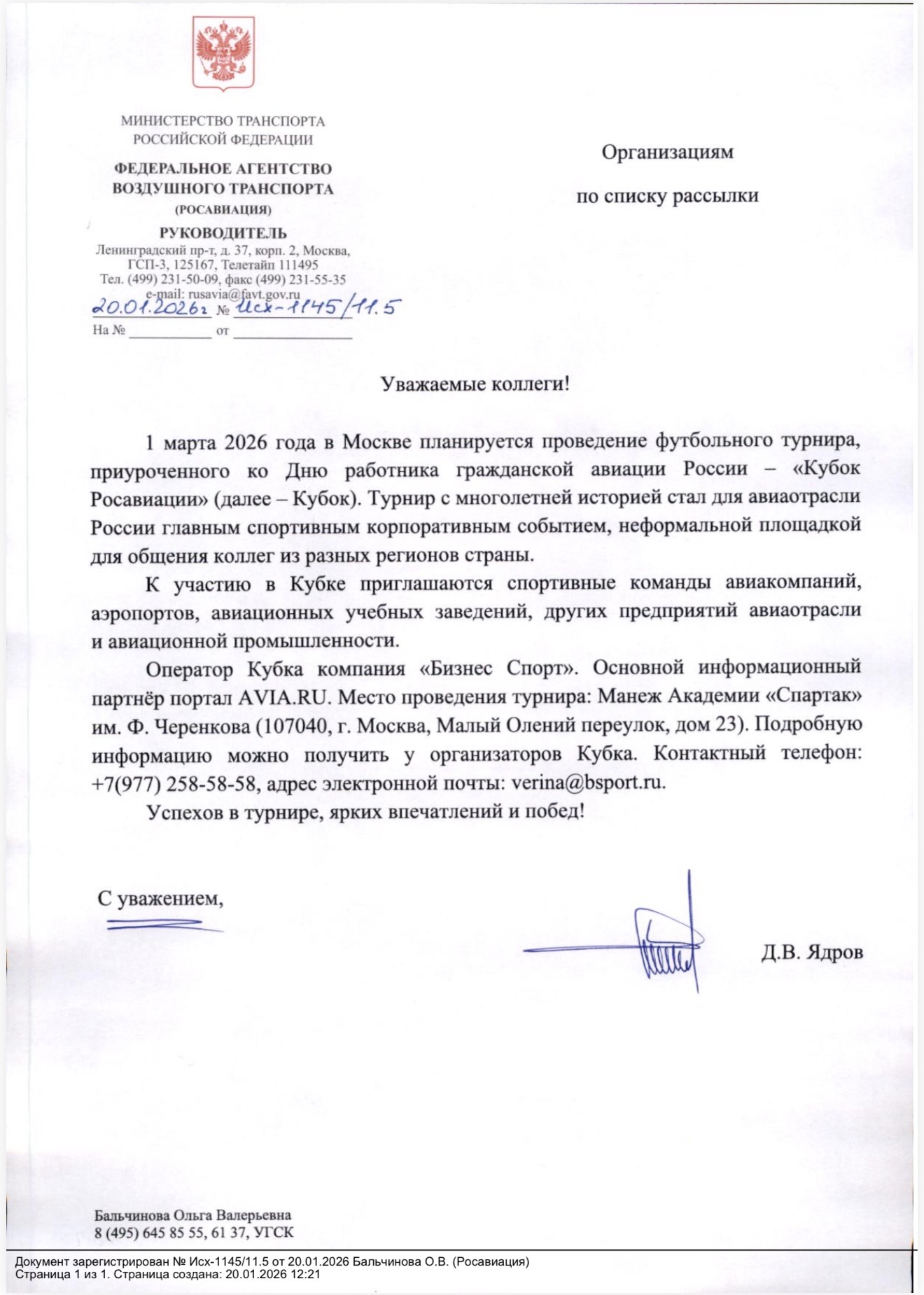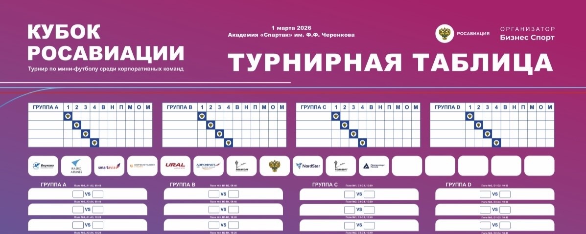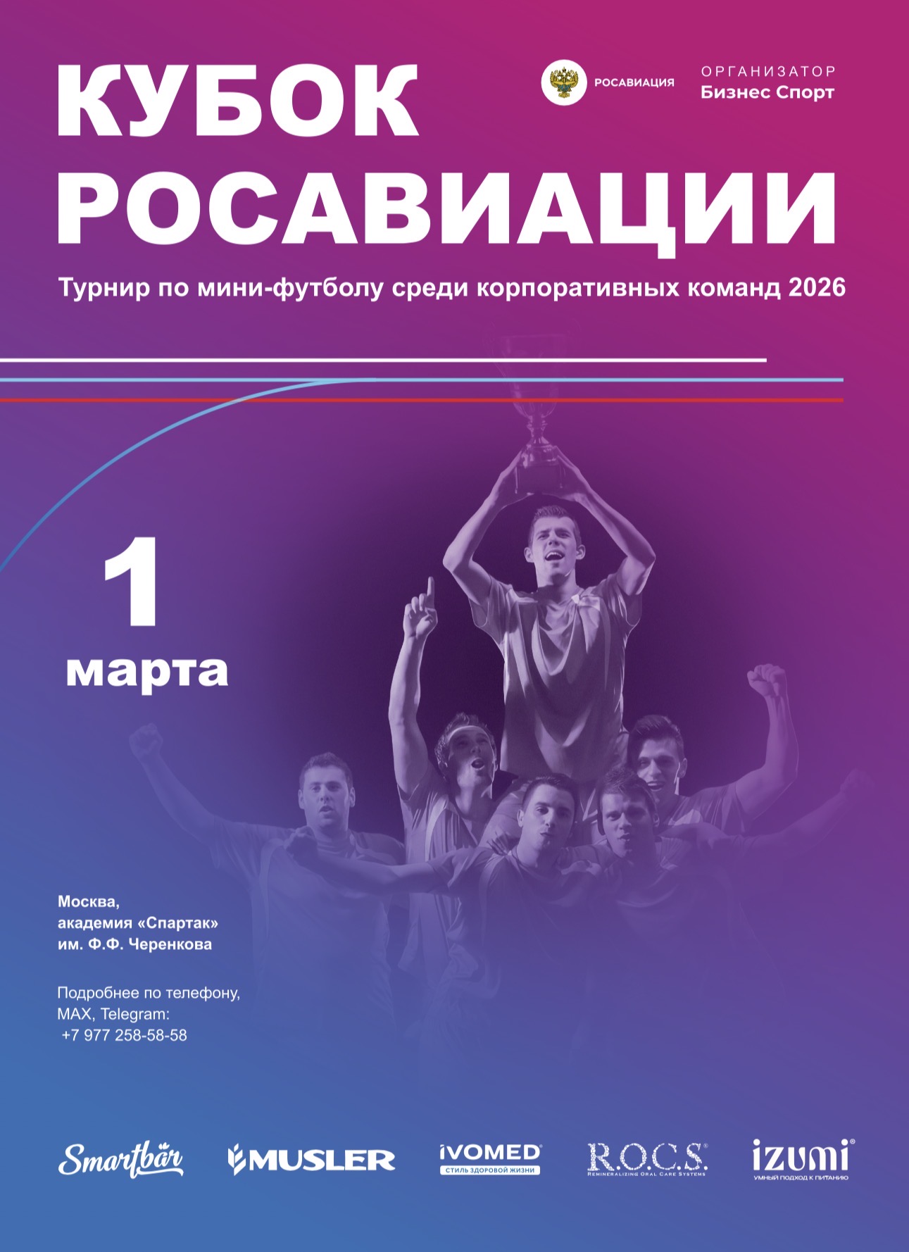 1 марта 2026 года, в Москве, в Манеже Академии «Спартак» им. Ф. Ф. Черенкова, состоится турнир по мини-футболу «Кубок Росавиации'26».